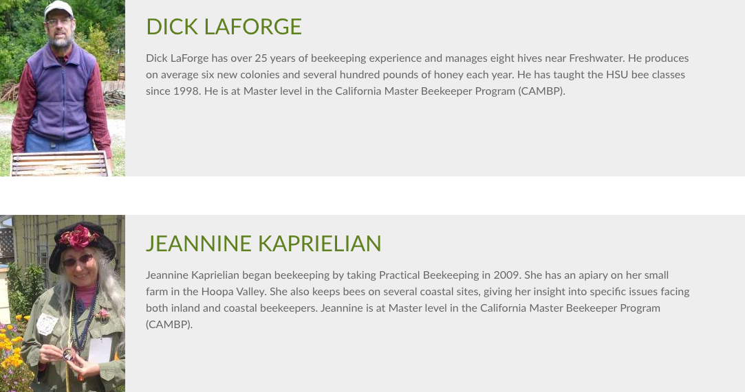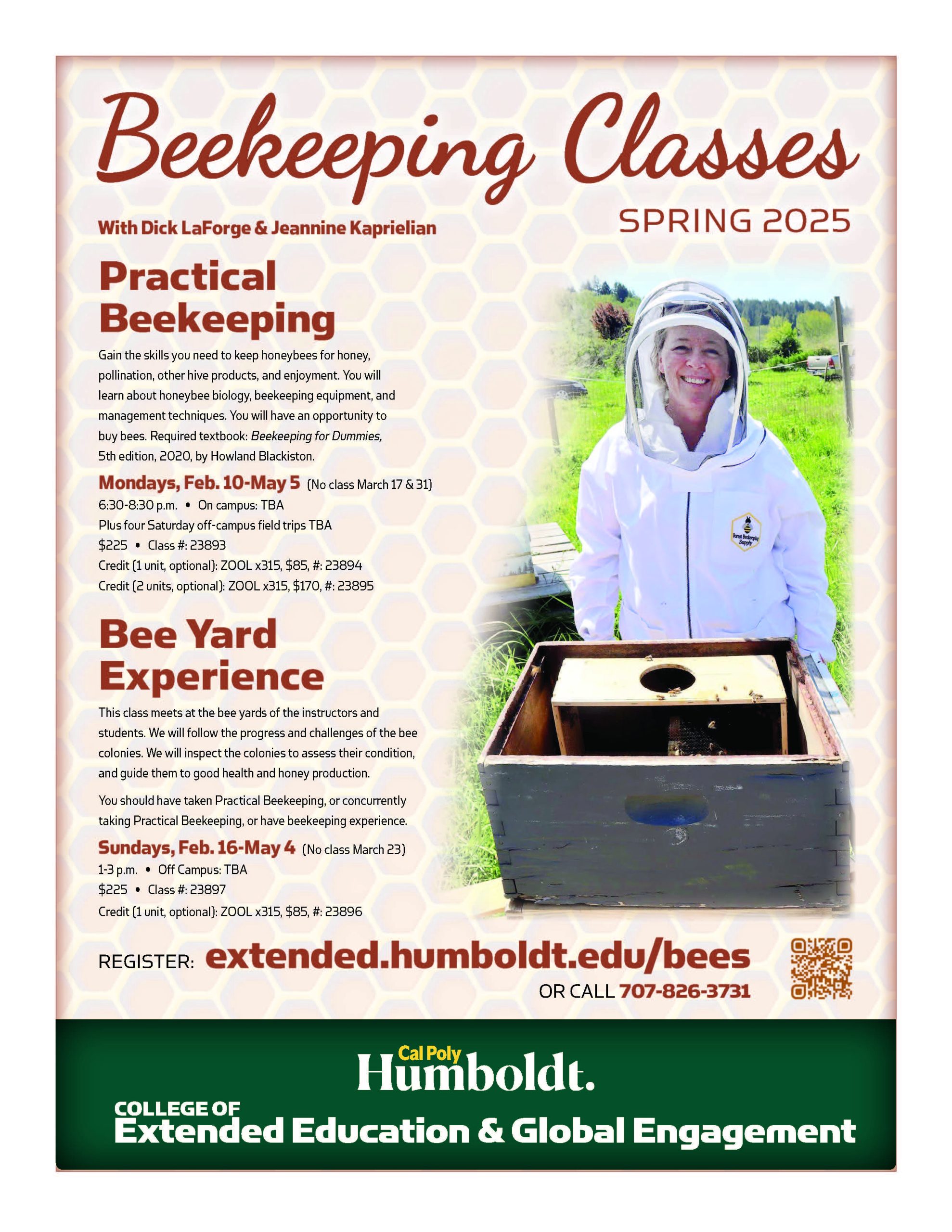 Cal Poly Humboldt Extended Education will offer two beekeeping classes in 2025, taught by Dick LaForge and Jeannine Kaprielian.